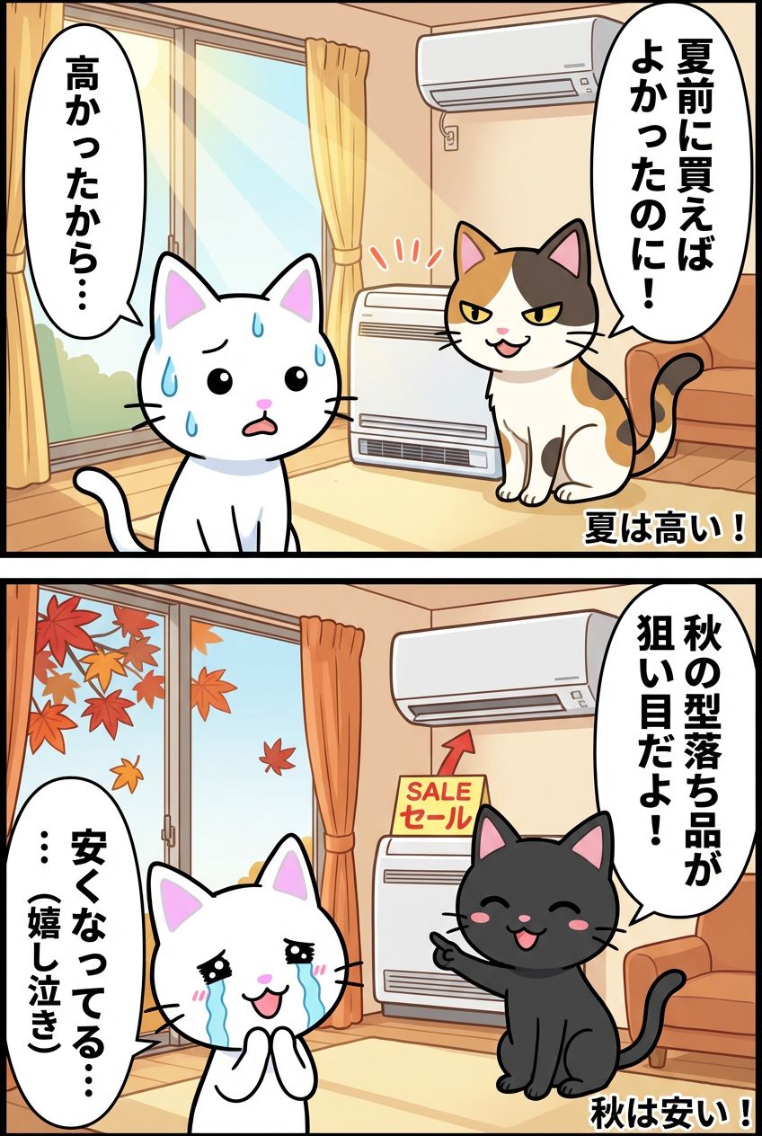 もし「古くなったけれどまだ使えるエアコンを買い替えよう」と考えている方がいらっしゃれば、9月から10月にかけての購入をおすすめします。