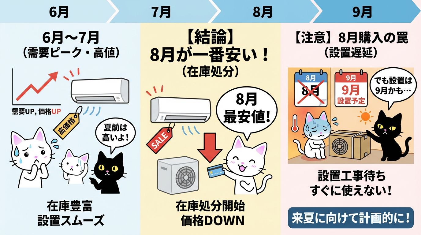 8月はエアコンの価格が最も低くなる時期で、お得に購入するチャンスです。