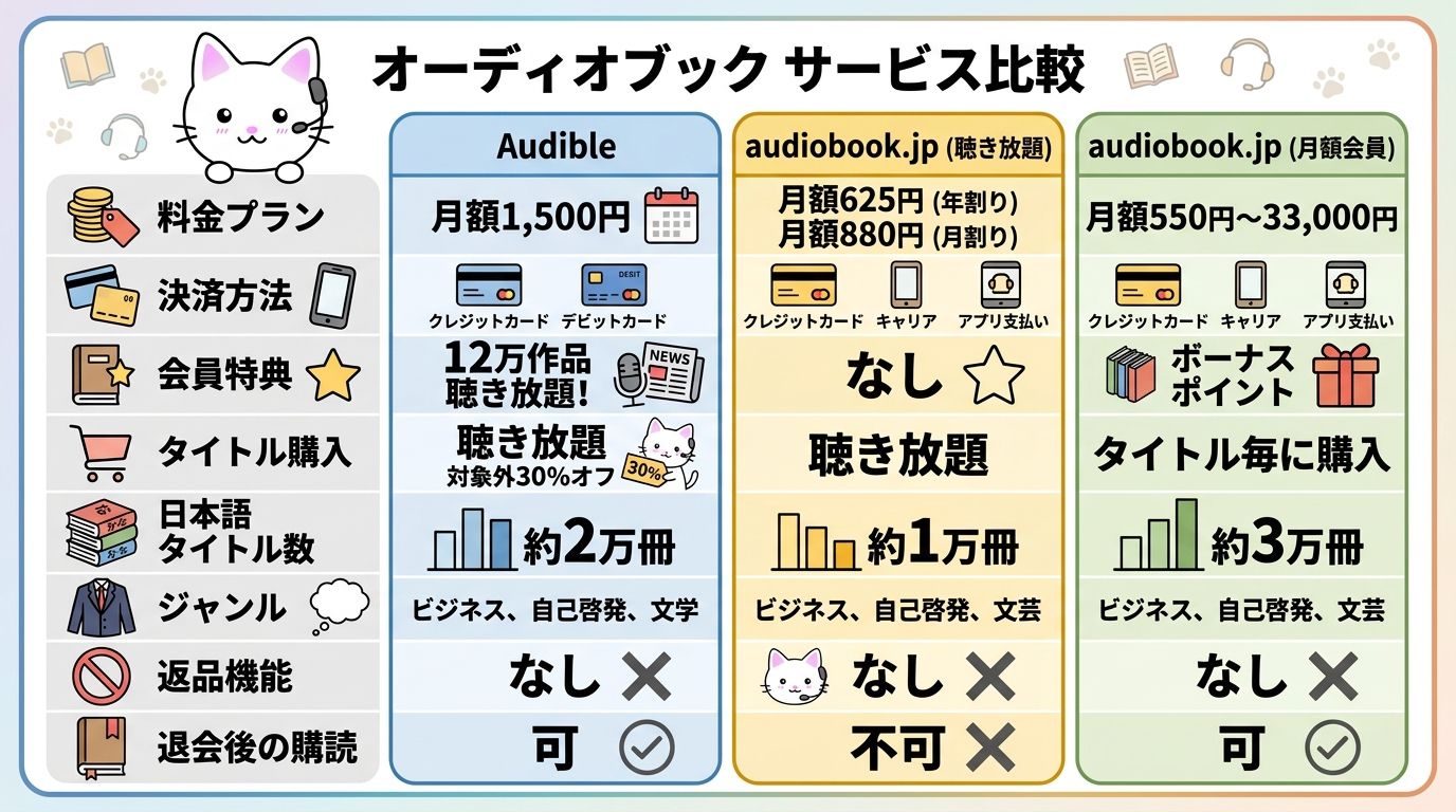 | 項目 | Audible | audiobook.jp(聴き放題) | audiobook.jp(月額会員) |