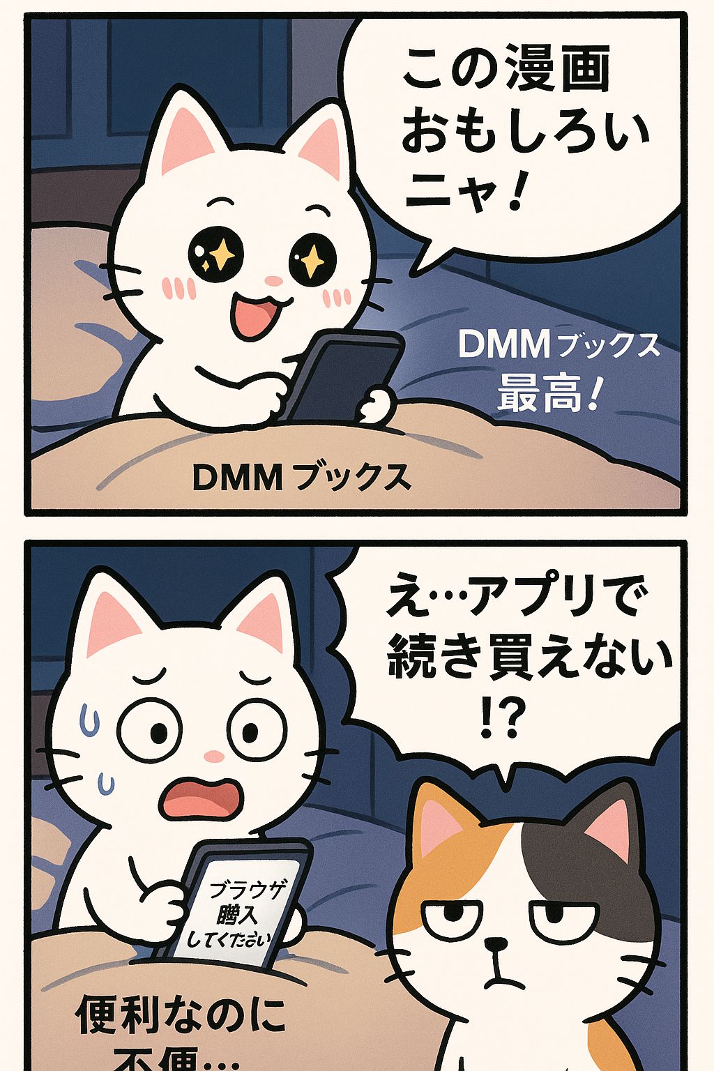 とくにページをめくるときに少しモサッとした動作を感じるという口コミが目立ち、読書中の操作レスポンスがもう少しスムーズになると嬉しいという意見が多く寄せられています。また、DMMブックスの弱点としてよく指摘されるのが「アプリ内で続編を購入できない」仕様です。