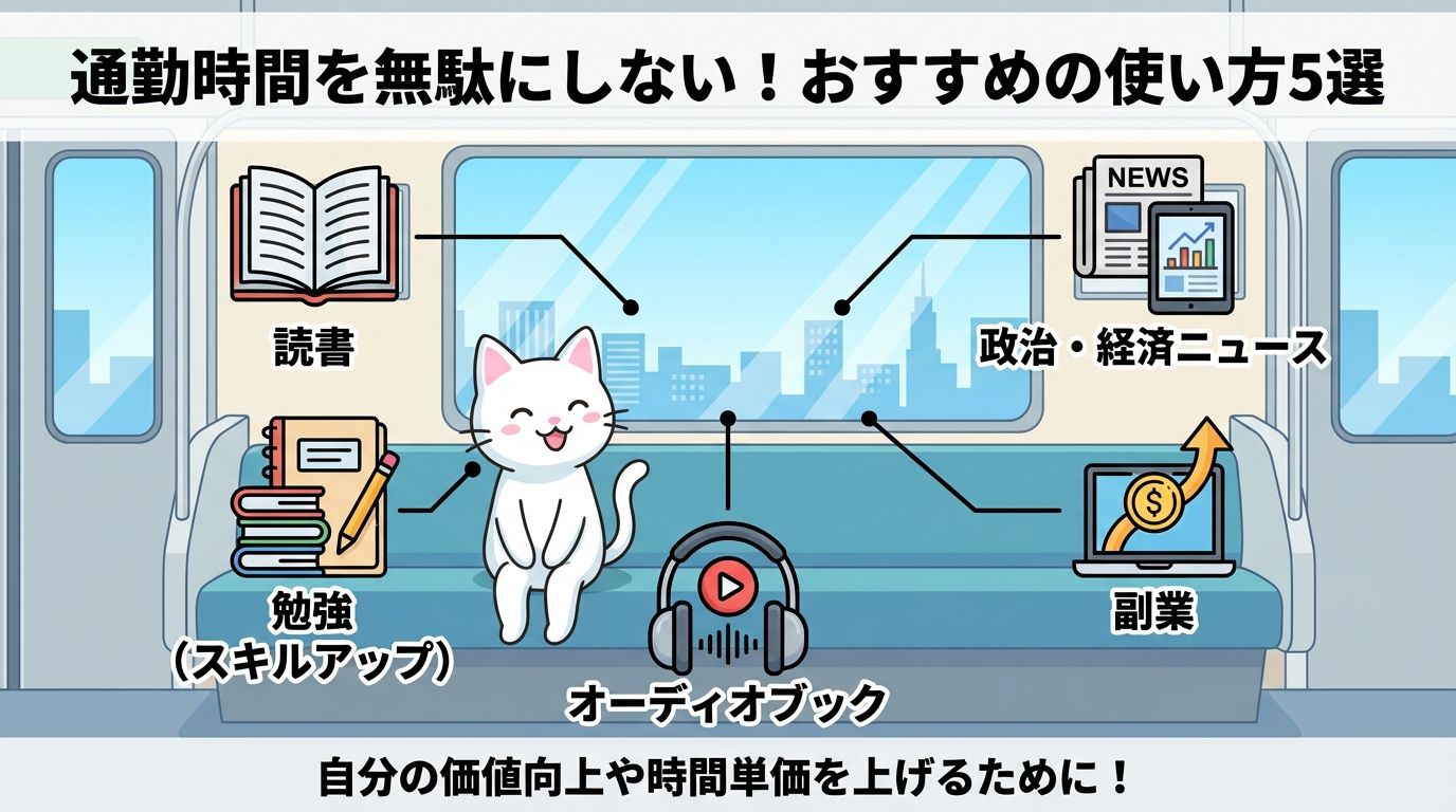 通勤時間を有効に活用するためのポイントは、自分の資産価値向上や時間単価を上げるために使うことです。