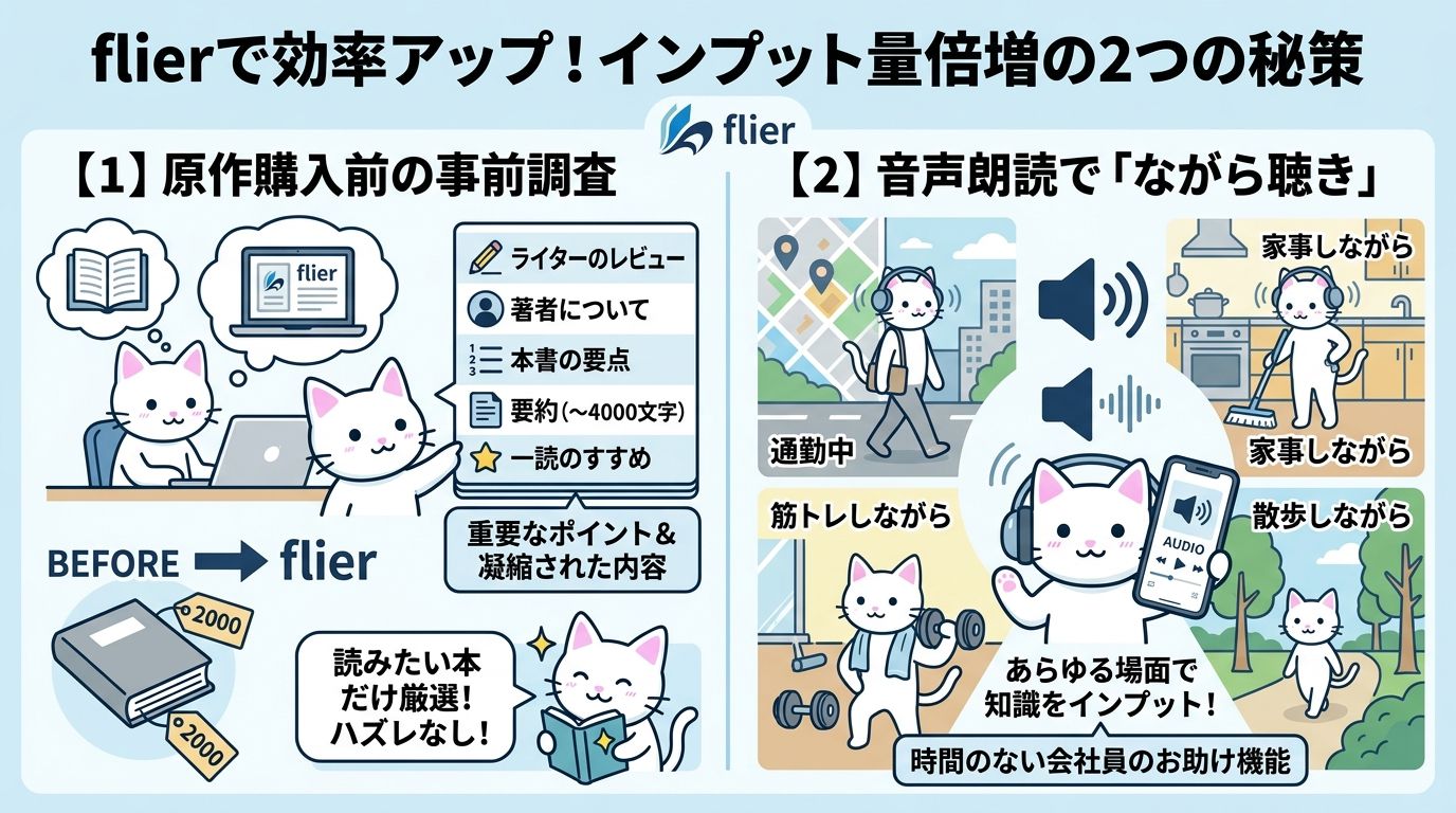 flier(フライヤー)は、本を読む十分が時間をとれない社会人が、効率的にビジネス書や自己啓発本の内容をインプットできる優れたツールです。