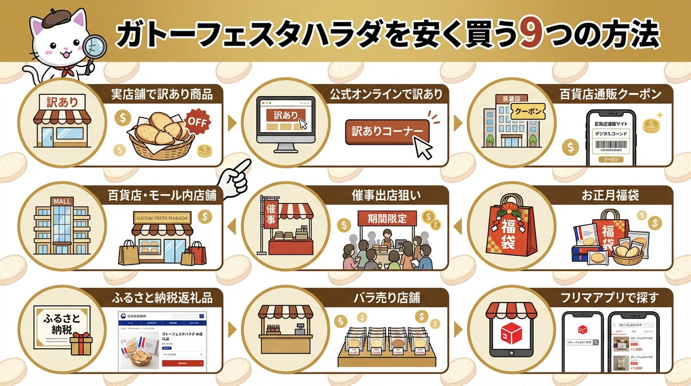 これらの店舗では、セール時期など特別なプロモーションを利用することで、さらにお得にガトーフェスタハラダの商品を購入できるチャンスがあります。