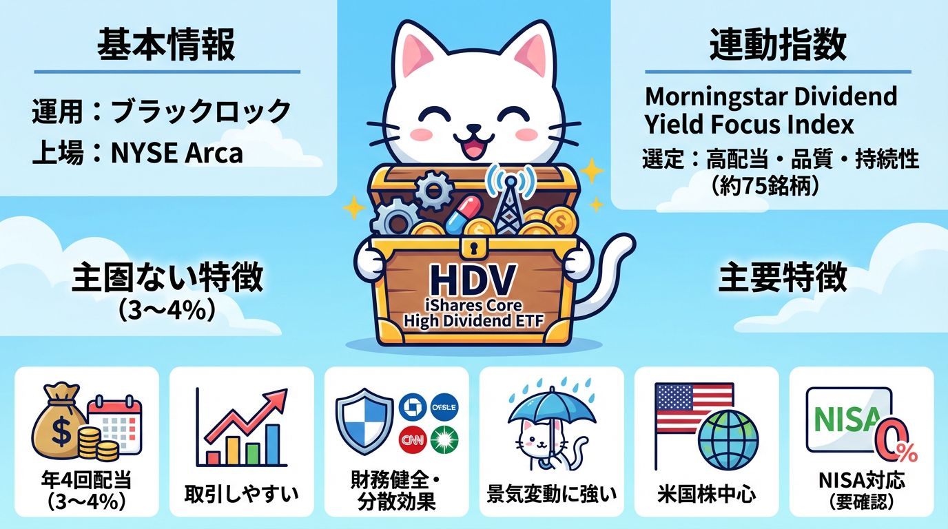 この記事では高配当ETF【HDV】の特徴・仕様・他ETFとの違いを、2026年時点の最新データを交えながら詳しく解説していきます。