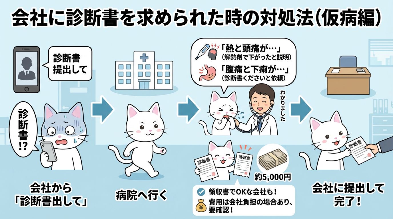 この記事では、体調が悪いふりをして会社を休んだら、診断書を出すように言われたときの対処法についてお話しています。