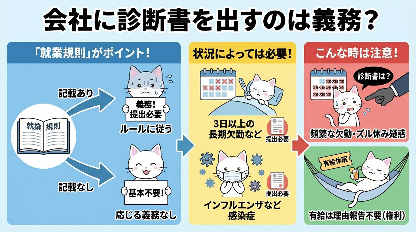 たとえば、会社のルールに「診断書が必要」と書いてある場合は、従業員はそれに従わなければなりません。