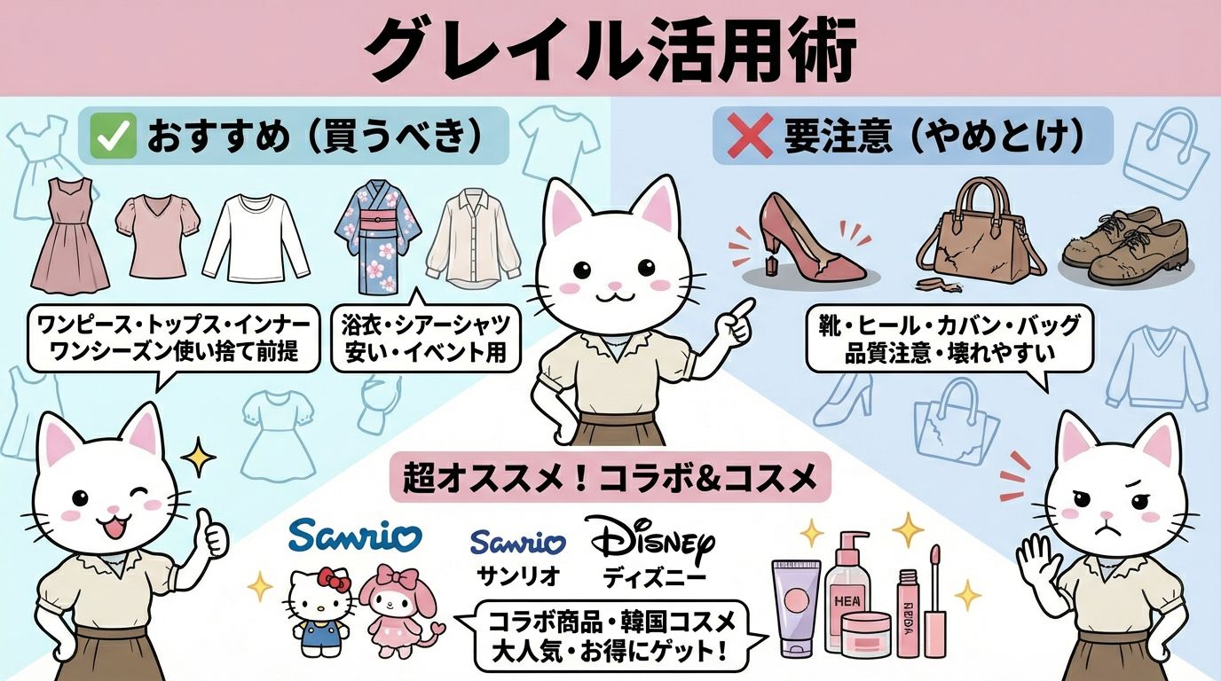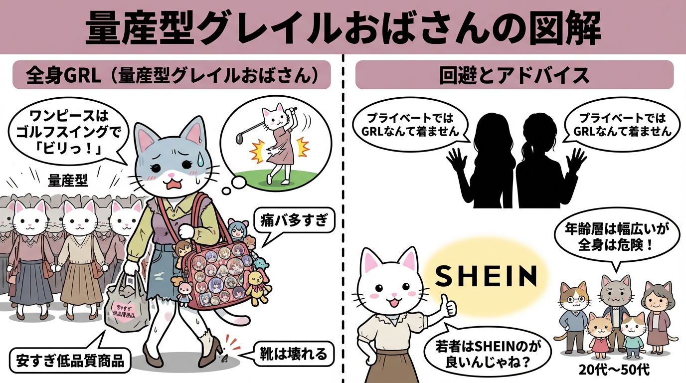 安すぎ低品質商品が多く、全身GRLにすると「量産型グレイルおばさん」と呼ばれるようになるので危ない