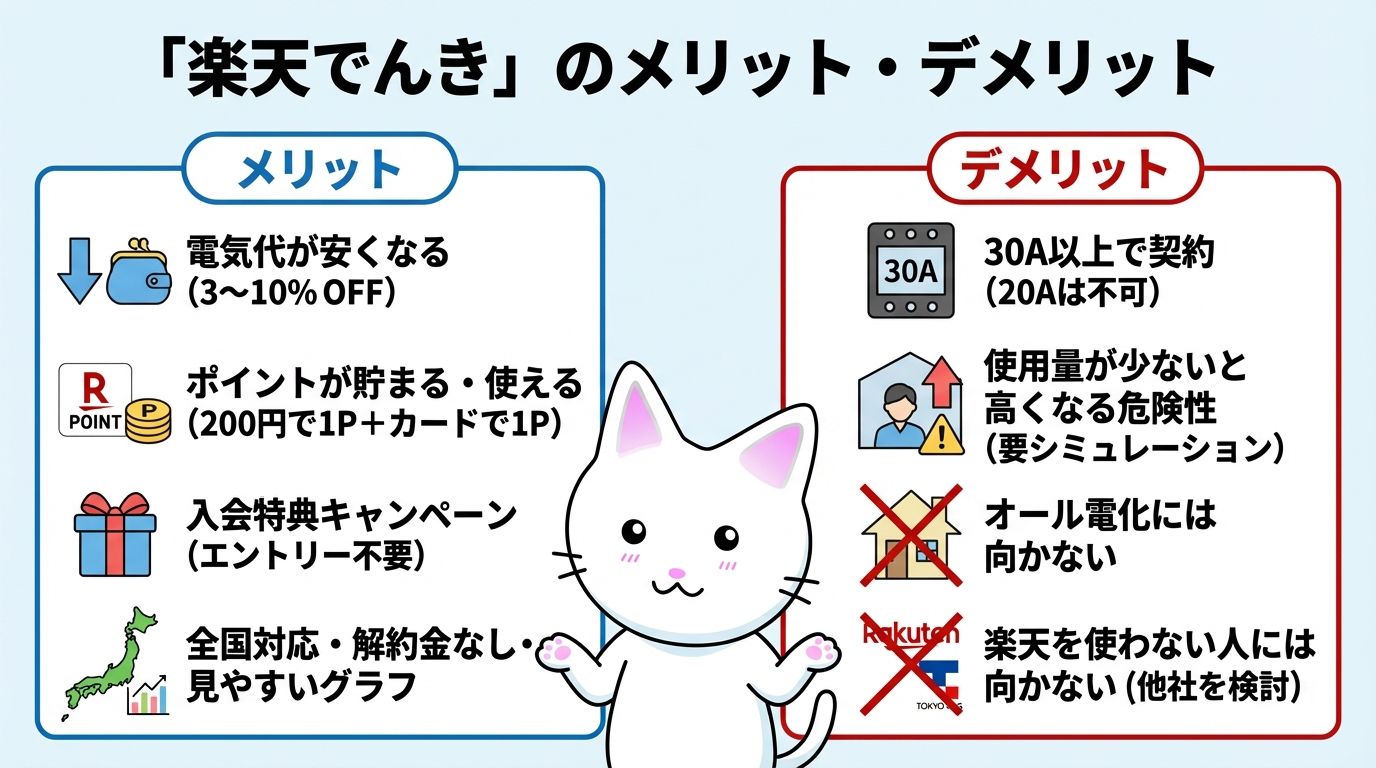 詳細は後述しますけど、最初に「楽天でんき」のメリット・デメリットを整理しておきます。
