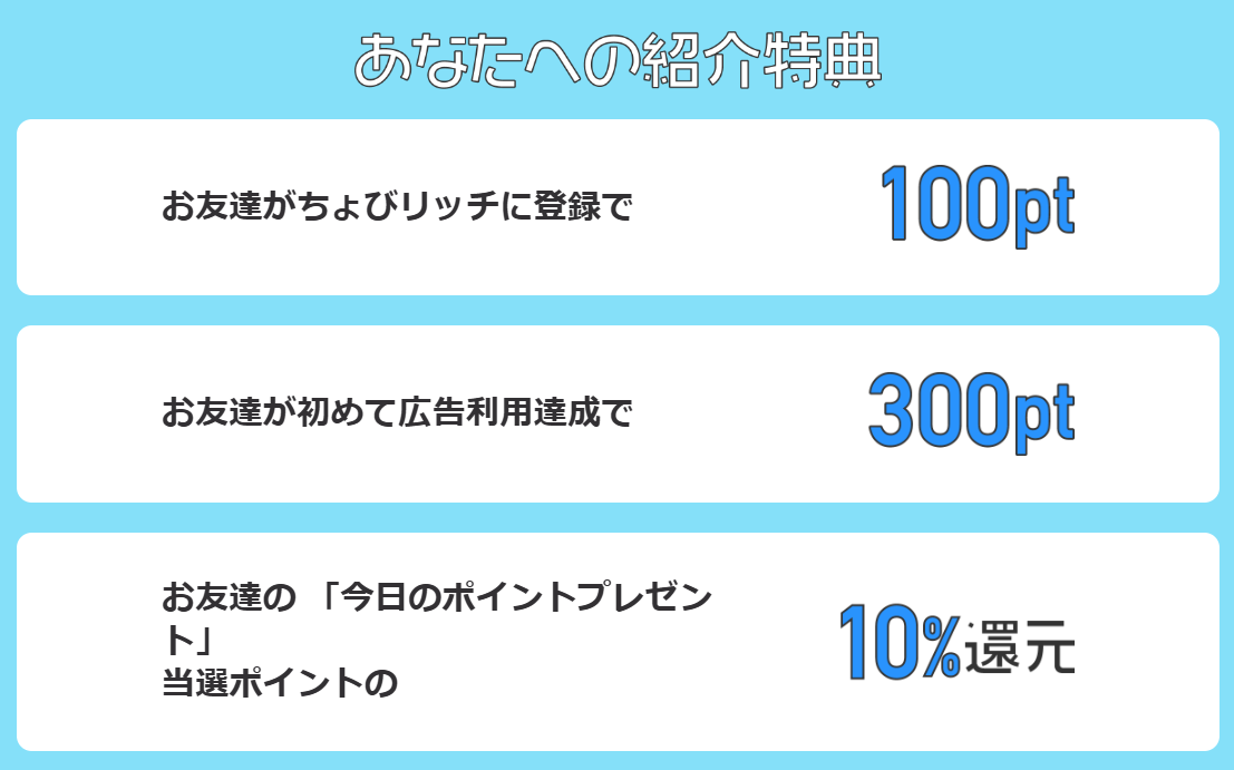 これから「ちょびリッチ」を始める人は、紹介特典をもらっておかないと損ですので、本ページの紹介リンクを活用ください。