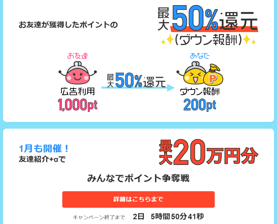 ダウン報酬:お友達の獲得ポイントの最大50%