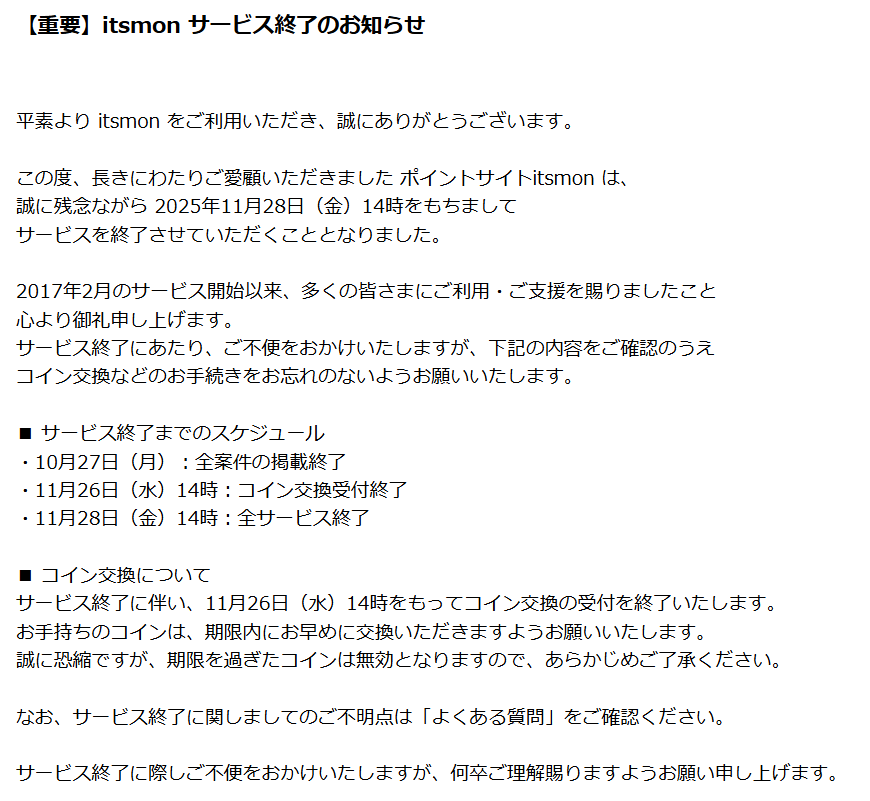 ポイントサイト「itsmon(いつもん)」が、2025年11月28日をもってサービスを終了するという知らせを聞きました。正直、ショックです。長年お世話になったサイトの幕引きは、まるで古い喫茶店が静かに店を閉めるような寂しさがあります。