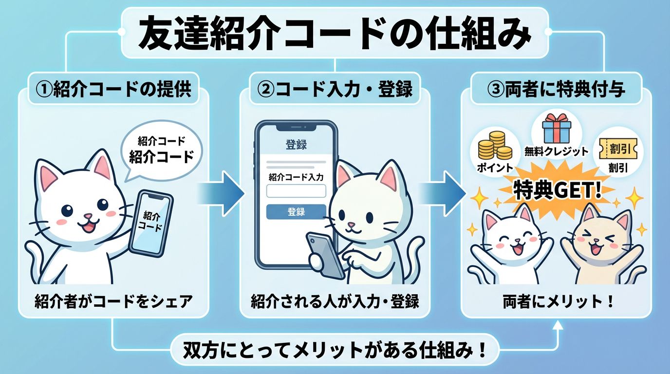 友達紹介コードの仕組みは、新規ユーザー獲得や既存ユーザーの活性化を図るために利用されることが多く、双方にとってメリットがある仕組みです。
