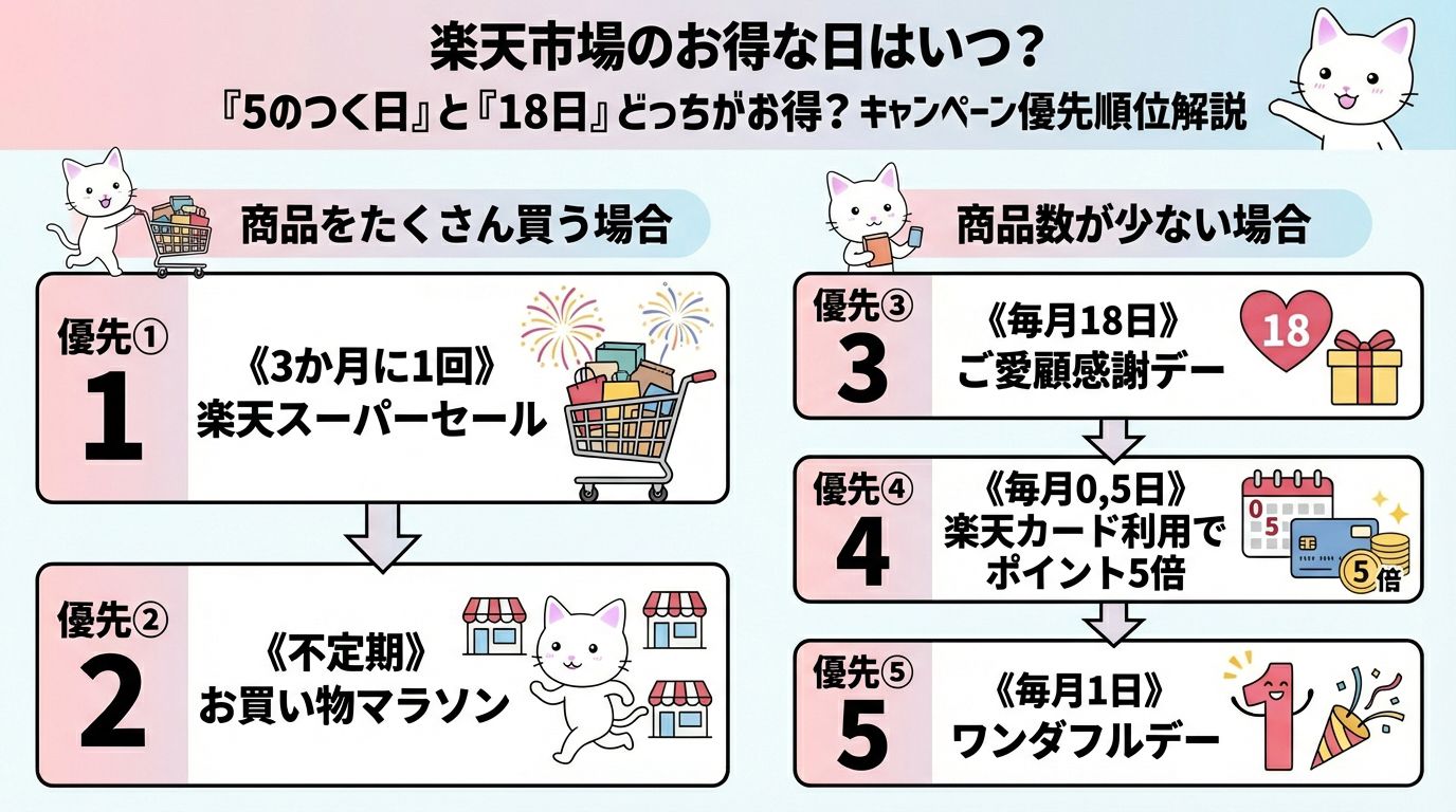 楽天キャンペーン優先順位は?お得な買い方は?損したくない人は、スーパーセール>マラソン>18日>0・5日>1日の順に。