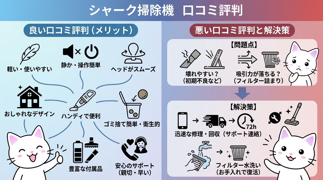 ですが、シャークの掃除機を購入する際には、これらの良い口コミだけでなく、否定的な意見もしっかりと確認することが大切ですね。