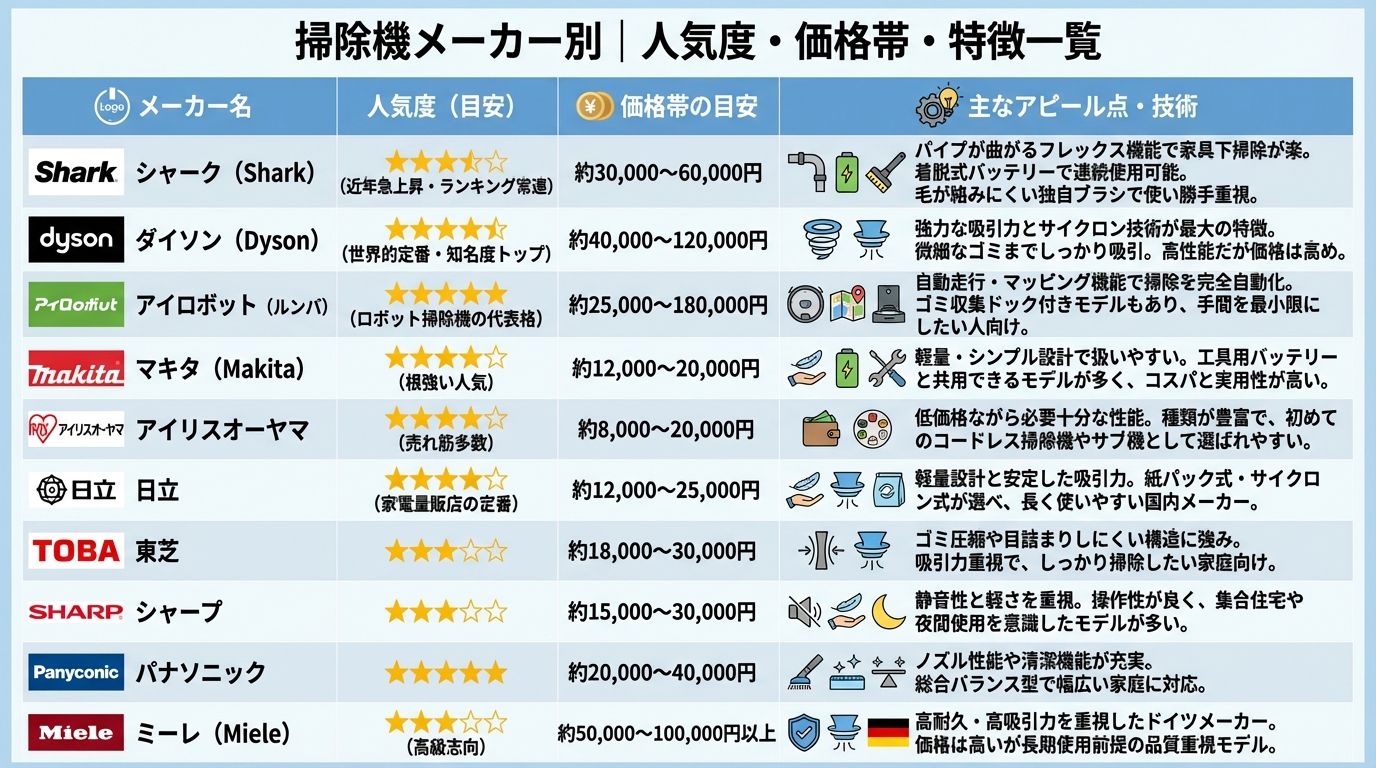 メーカー名 人気度(目安) 価格帯の目安 主なアピール点・技術
