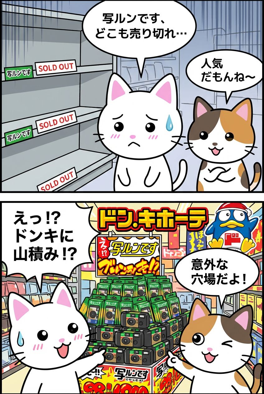「写ルンです」は、ドンキホーテや家電量販店、コンビニなど、実はさまざまな場所で購入できます。とはいえ、人気の高さゆえに店舗では売り切れ・在庫なしというケースも少なくなく、「何軒も回ったのに結局買えなかった…」という声が後を絶ちません。