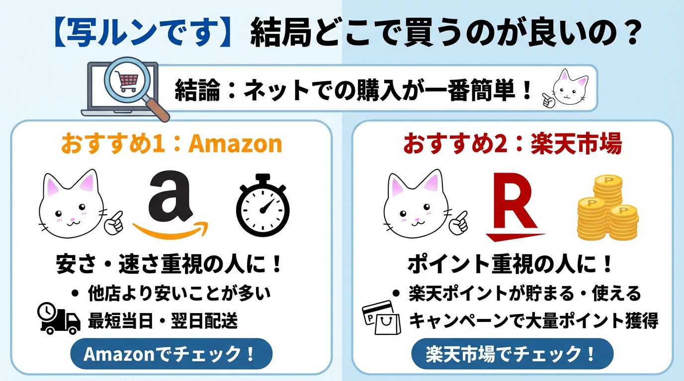 そんな無駄な手間や時間をかけたくないなら、最も現実的で賢い選択肢はやはりオンラインショッピングです。中でもAmazonは、在庫の安定性、価格の分かりやすさ、そして圧倒的なスピード感が魅力。条件が合えば当日〜翌日には手元に届くため、「今すぐ使いたい!」という気持ちを逃しません。